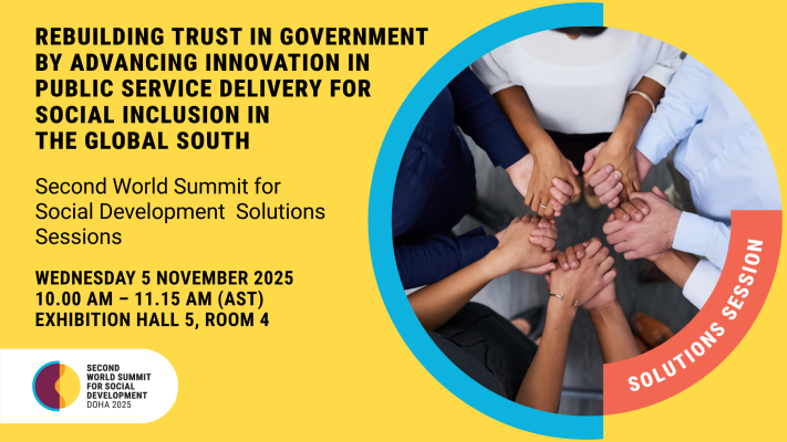 A Solution session on “Rebuilding Trust in Government by Advancing Innovation in Public Service Delivery for Social Inclusion in the Global South” will be organized by the United Nations Department of Economic and Social Affairs (UN DESA), through its Division for Public Institutions and Digital Government and its Project Office on Governance (UNPOG), in collaboration with the Ministry of Foreign Affairs of the Republic of Maldives and the United Nations Economic and Social Commission for Western Asia (ESCWA) within the framework of the Second World Summit for Social Development to be held in Doha, Qatar, from 4 to 6 November 2025. The Solution Session will be held at the Qatar National Convention Center in Exhibition Hall 5 Room 4.